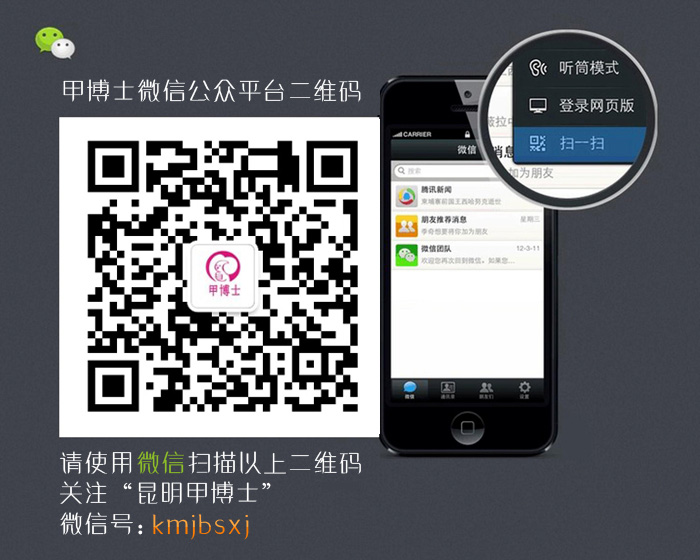 请大家及时通过微信搜索:昆明甲博士 kmjbsxj或扫描下面二维码及时了解!